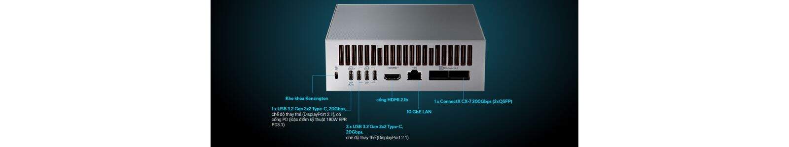 ASUS Ascent GX10 được trang bị hệ thống cổng kết nối hiện đại và đa dạng, đáp ứng đầy đủ nhu cầu kết nối trong môi trường AI chuyên nghiệp. Với cổng USB 3.2 Gen 2 Type-C tốc độ cao 20Gbps, hỗ trợ DisplayPort 2.1 và PD 180 W, cùng HDMI 2.1b và mạng LAN 10GbE.